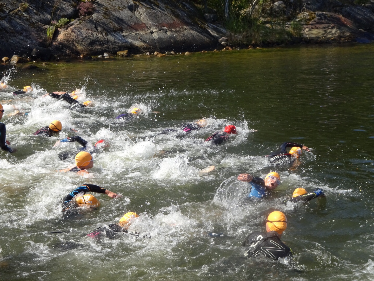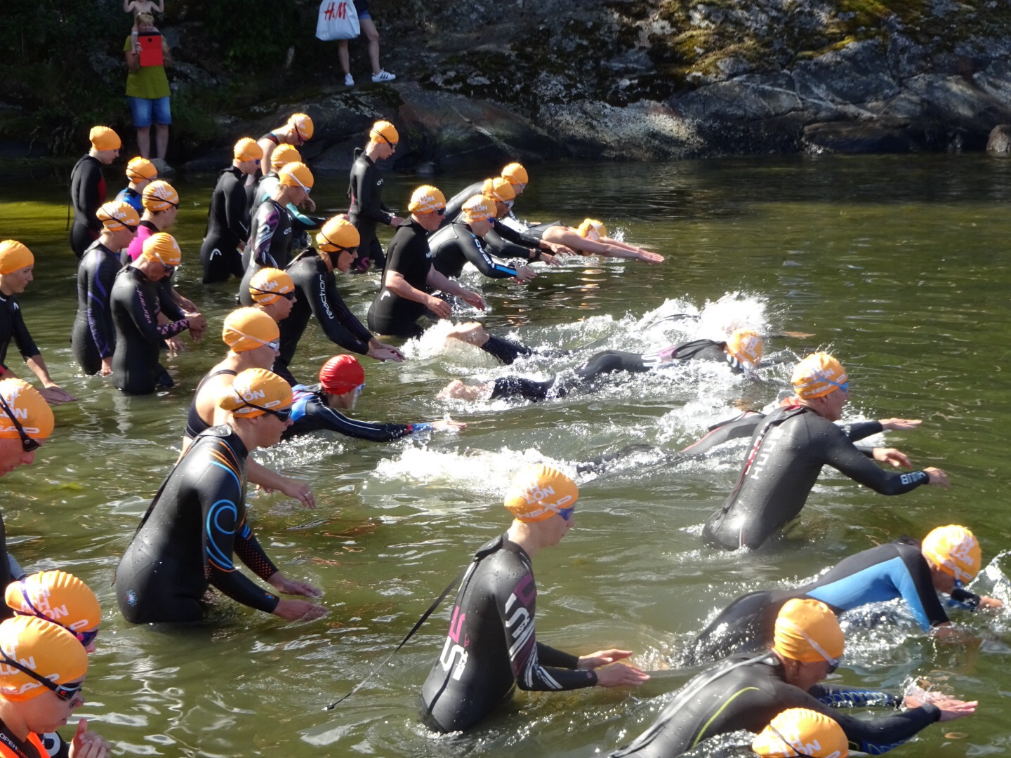 Äntligen fick dom ta plats på startplatsen som är den exakt samma som eliten använde i år, enda skillnaden är att eliten startar från bryggan och motionärerna startar i vattnet. 20 grader i vattnet men rätt gropigt var facit när allas våran triathlet simmat klart.