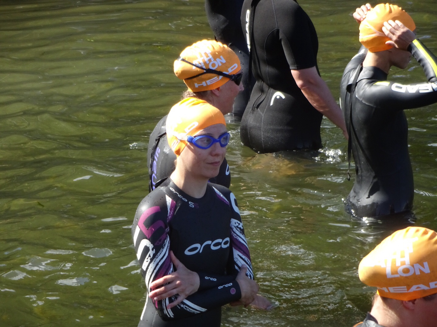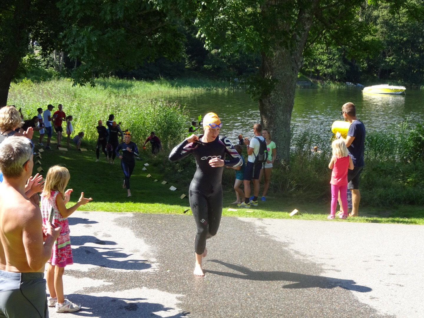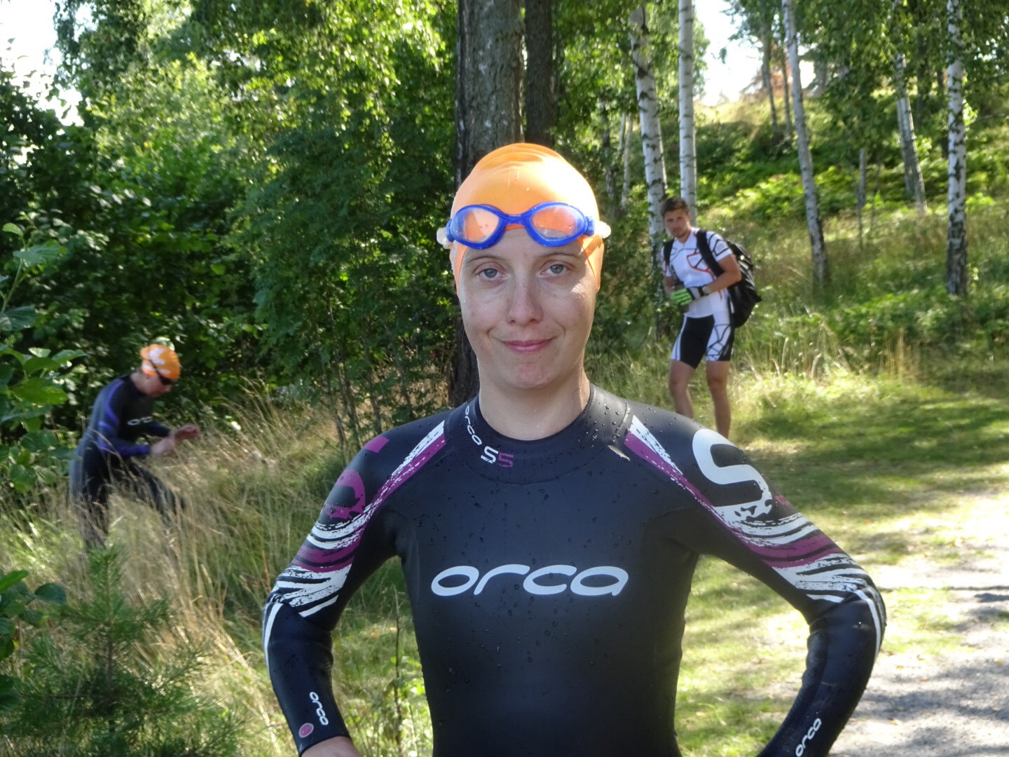 Lite svårt att ta actionbilder när dom simmar då alla har svart våtdräckt och obligatorisk orange mössa så jag fick nöja mig med en snabb bild på Karins baksida när hon sprintade upp ur vattnet för växling till cykling.