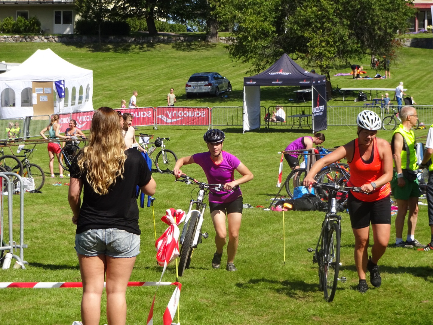 Vi drog ut till Lidingö så att vi kunde vara där en timme före start för att Karin skulle hinna hämta nummerlapp, ställa upp cykel och skor i sin fålla. Perfekt väder och inte mycket vind borde bädda för ett bra lopp när 40 brudar i våtdräkt ställde upp för start inför 850 meter simning.