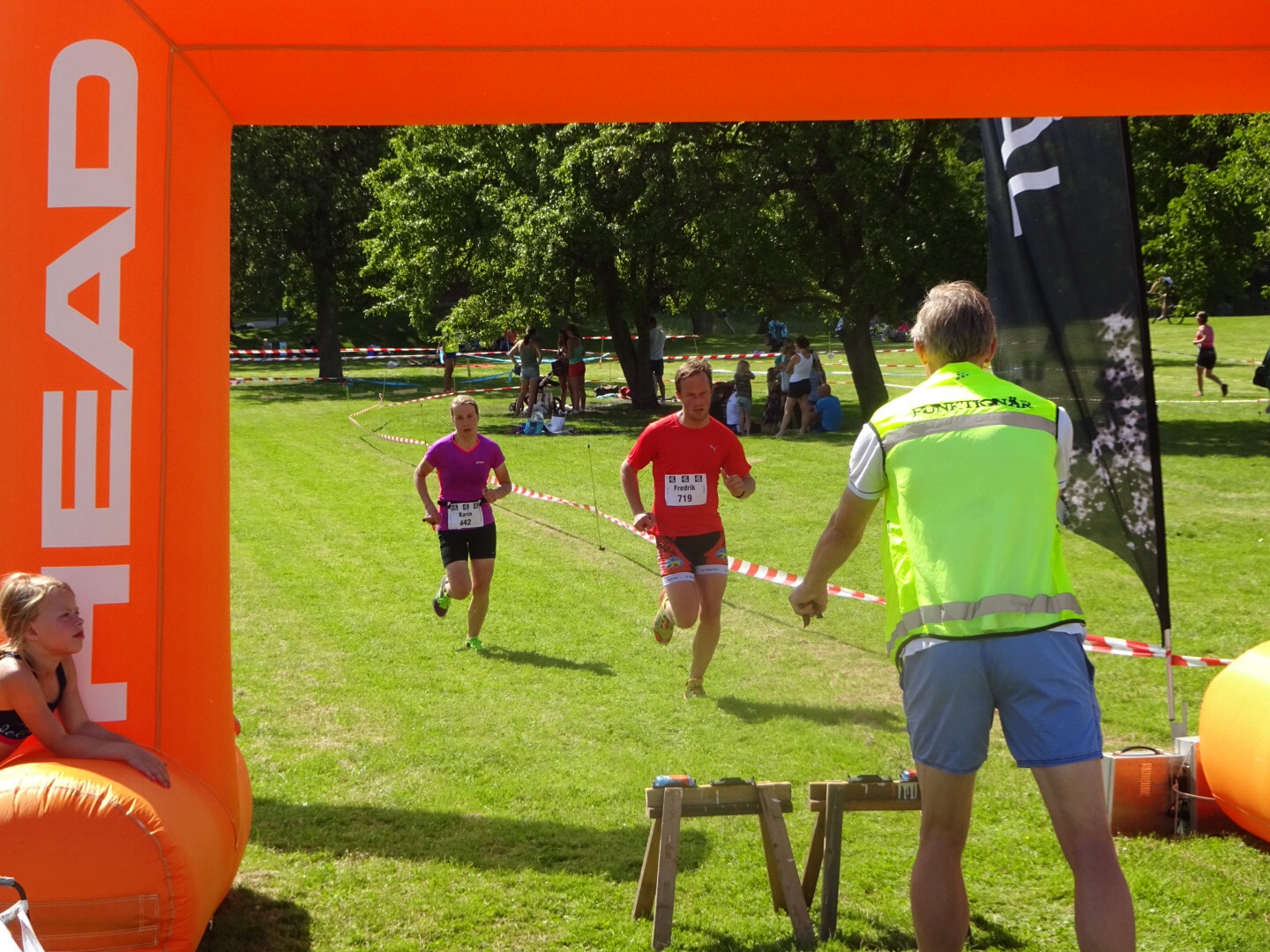 Med cyklingen avklarad så var det ”bara” löpningen kvar , hmmmm bara kanske är att underdriva det hela när man hållet igång i nära 70 minuter men detta är ju Karins paradgren så hon dundrade på och plockade placeringar, alltid kul att se när hon drar på. 5 km löpning och även denna del i en tvåvarvsbana där man nästan kunde välja löparna hela varvet.