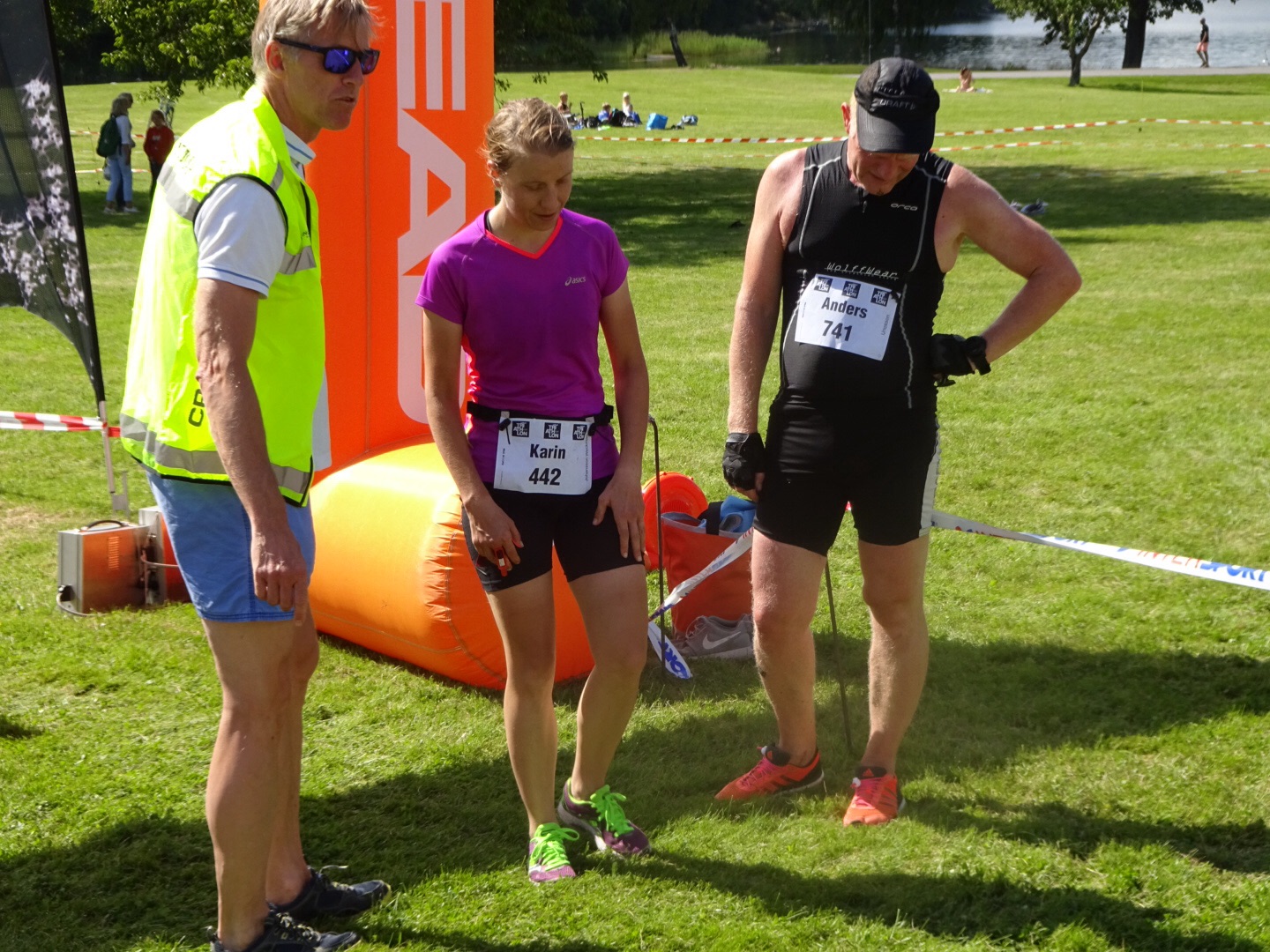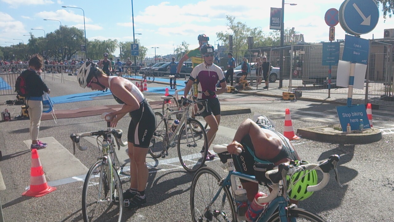 Upp vid 8 för att kunna vara vid stadshuset en timme före start så att Karin kunde checka in cykeln samt lägga fram prylarna som behövs i växling mellan simning till cykel till löpning.