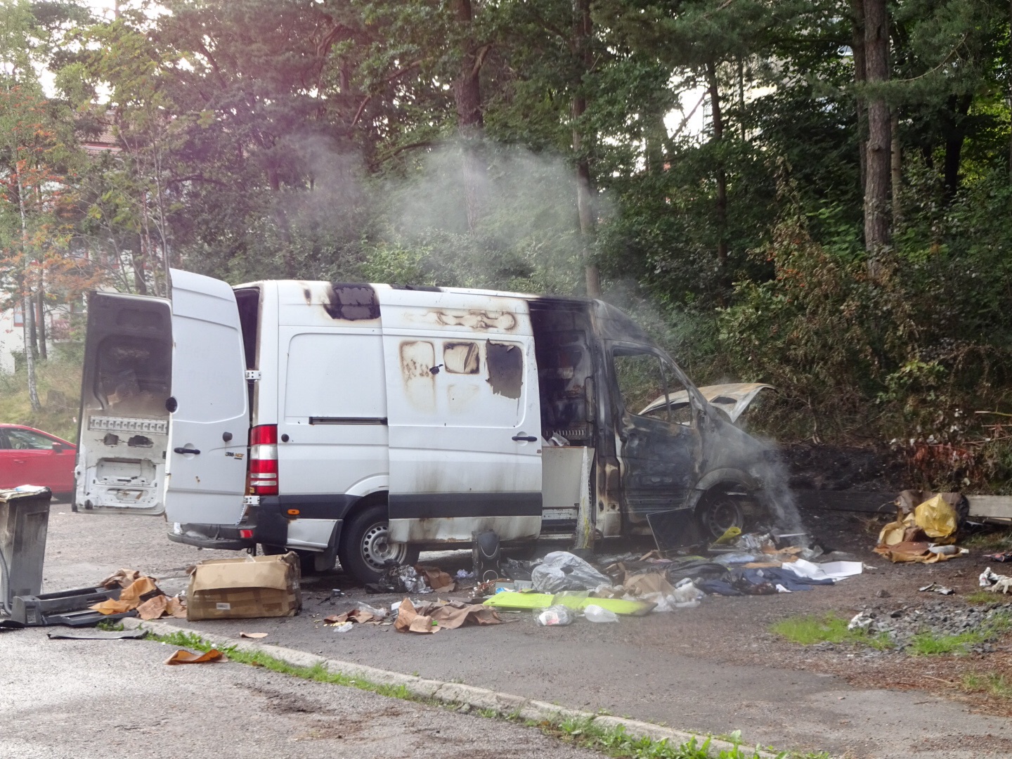Morgontrött och med slitna ben hinner man ta ett 40 tal tramptag innan det känns som om man passerar en mindre krigszon, bilen eller dom utrivna sakerna pyr fortfarande efter något som liknar en bilbrand på en parkering 150 meter från oss. Konstigt är att det är 150 från vårat sovrumsfönster och vi har inte hört något, antar att det inte behövdes brandkår för att släcka branden.