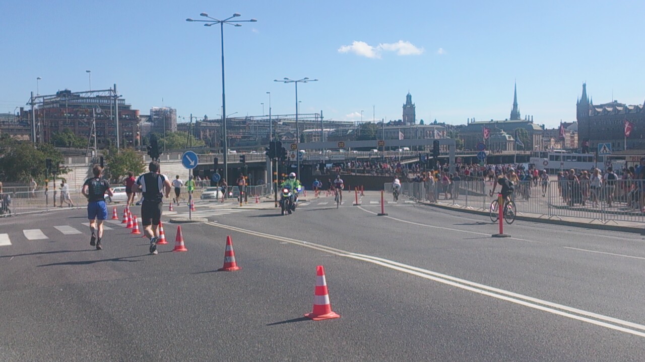 Varvning vid stadshuset inför sista halvan före löpning. Karins tid över 40 km blev 1 timme 18 minuter vilket är riktigt bra. Här kom hon ikapp och körde om en funktionärs MC.